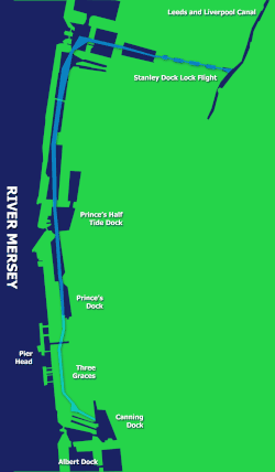 The docks between Salisbury Dock and Prince's Half-Tide Dock were filled in with just a small drainage channel remaining. Following dredging in the 1990s, this section was in water and navigable. Further dredging took place at the northern edge of the Trafalgar Dock infill.
