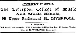 During its existence, the College moved first to 98 Upper Parliament Street (a building whose freehold had been bought in 1880 by the Liverpool Art Club Building Co., Ltd to rent out, originally, to Liverpool Art Club; it was renovated in 1881 to incorporate a new 60 ft gallery designed by W. & G. Audsley, who were LAC members),[7][8] and then, sometime after 1895, to Canning Street.[9][10] A directory from 1900 shows the Liverpool College of Music (Ltd) registered at 98 Upper Parliament Street, while Hardman Street is instead shown as home of the Liverpool Conservatoire of Music (also run by Alex J. Phipps: see below). A Liverpool Institute of Music (in Mount Pleasant) and Liverpool School of Music (in Bedford Street) are also shown (as is, coincidentally, Richard Francis Lloyd).[11]