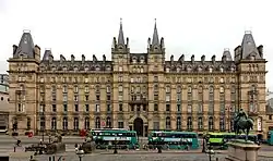 Lime Street Station is fronted by a large building, built in the Renaissance Revival style, which formerly housed the North Western Hotel.[31] Designed by Alfred Waterhouse, the building was built during 1871 and served as student accommodation for Liverpool John Moores University from 1996.[32][33][34] It was announced on 28 September 2018 that the building will be restored as a hotel by the Marcus Worthington Group at a cost of £30m. It will reopen as the Radisson RED Liverpool Hotel in 2020.[35]