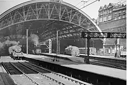 Upon nationalisation of the railways during 1948, Lime Street Station became a part of the London Midland Region of British Railways. On 28 January 1948, a new signal box controlling movements in and around Lime Street was commissioned; this signal box would remain in use for almost 70 years, being one of the last lever frames boxes still in operation by the time of its decommissioning during 2017–2018.[37] During 1955, the station concourse was redeveloped and modernised.[14] During 1959, preparatory work commenced at Lime Street for the first stage of the electrification of the West Coast Main Line.[38] On 1 January 1962, regular electric services between Lime Street and Crewe were officially started.[39]