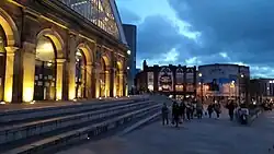 An office tower block named Concourse House, along with a row of small retail outlets, used to stand outside the southern train shed, obscuring the arches. These dated from the 1960s, and by the 2000s had become run down.[45] They were demolished as part of a comprehensive refurbishment completed in 2010.