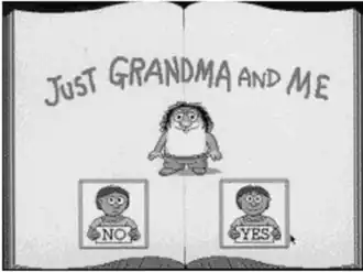 When Schlichting was first designing Living Books, he visited computer stores to observe how software was displayed and marketed, and noted that they used their games' assets to show off the computer's capabilities.[6] As a result, he developed an "attract mode"[6] where at the beginning before the story starts, the main character direct addresses the user by introducing themselves, teaches the child how to play, and then invite them to participate.[5] In Just Grandma and Me, the narrator Little Critter tells the user, "To have the story read to you, press this button. To play inside the story, press this button", pointing to the appropriate button onscreen.[48]