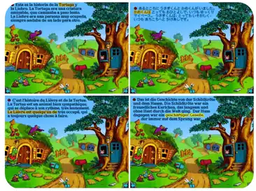 By August 1992, the title was the interactive storybook's "first big hit", and one of the few available for purchase, along with the even earlier Canadian pioneer Discis Knowledge Research's Discis Books, whose 16 Mac titles and 11 CDTV titles had gained widespread classroom acceptance.[15] Founded in 1988, Discis acquired the rights to children's stories and published them as CD-ROM-based interactive children's books.[98] The second Living Books title, Arthur's Teacher Troubles, was debuted at Consumer Electronics Show showcasing its first 12 screens.[99] When the game was demoed at trade shows, the developers observed audience reactions which proved to be a useful learning experience.[6] Microsoft bought 300 disc copies and sent them to Multimedia PC hardware manufacturers, instructing them to ensure the software could run on their equipment.[6] Before The Tortoise and the Hare was released, a prototype was shown at a trade show where a teacher in attendance noted that a scene where Hare picks up a newspaper, rolls it up, and stomps on it was encouraging kids to litter; in response Living Books redrew the scene, which now showed the tortoise scolding the hare, with the line of dialogue "Hey Hare, did you forget to recycle that newspaper?", who picks up the trash and disposes of it properly.[68][100] Literacy in Australia: Pedagogies for Engagement singled out this moment for helping users "make sense of character motivations and actions".[101]