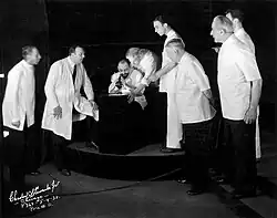 On the other hand, Chicago produced an original Living Newspaper that rivalled those of New York in its impact and positive reception. In 1938, Arnold Sundgaard's Spirochete, a Living Newspaper on the history of syphilis, opened in Chicago.[45] Using the image projections, extensive sound design, shadowplay, brief scenes, and "little man" character (here, a patient embodying all syphilis sufferers throughout history[47]) made standard by the New York Unit, Spirochete followed syphilis from its introduction in Europe in the 15th century through to the social stigma surrounding it in the 1930s. The play promoted support for premarital medical examination laws, which required blood tests for syphilis prior to marriage.[47] Spirochete became the second most-produced Living Newspaper, after One-Third of a Nation[45] and ran in four other major cities as part of a nationwide syphilis education-and-prevention campaign.[48]