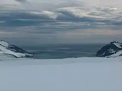 The principal mountain formations on the island comprise Tangra Mountains (32 kilometres or 20 miles long and 8.5 kilometres or 5.3 miles wide, with Mt Friesland rising to 1,700.2 m or 5,578 ft[10][11]), Bowles Ridge (6.5 km or 4 mi long, elevation 822 m or 2,697 ft), Vidin Heights (8 km or 5 mi, 604 m or 1,982 ft), Burdick Ridge (773 m or 2,536 ft), Melnik Ridge (696 m or 2,283 ft) and Pliska Ridge (667 m or 2,188 ft) in the eastern part of the island, and Oryahovo Heights (6 km or 4 mi, 340 m or 1,115 ft), and Dospey Heights (6 km or 4 mi, 265 m or 869 ft).[2] The local ice relief is prone to change; in December 2016 the elevations of Mount Friesland and St. Boris Peak were 1,693 m (5,554 ft) and 1,699 m (5,574 ft) respectively, making the latter the summit of Livingston in that season.[12] According to the American high accuracy Reference Elevation Model of Antarctica (REMA), Mount Friesland is 8 m (26 ft) higher than St. Boris Peak.[13]