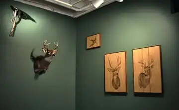 Young's embroidered drawings of the late 2000s were described as balancing finely wrought craft technique and rigorous conceptual underpinnings.[28][46][47] Working with and into freighted, found objects of Americana (flags, deer targets, stuffed animals), she offered both humor—a coat sewn from stuffed animal pelts, including ear flaps and plastic eyes or locusts and rats stitched onto old farming magazine covers—and social critique, as in Balmy Birds (2006),[48] an upside-down American flag whose embroidered black birds conveyed a sense of political anxiety and chaos.[49][28][45] Her 2013 show, "Still Life," incorporated taxidermy animals (a bird and deer) and graphite drawings on wood paneling of the same animals; together they functioned as contemporary memento mori or nature morte depicting images of nature as lifeless, still, and dislocated.[4][50]