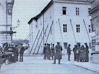 At the time, Ljubljana's population was some 31,000, with around 1,400 buildings.[1] The earthquake directly caused 21 death casualties,[1] two people died later while clearing the rubble and three children died several days after the earthquake due to the severe cold in their temporary accommodation. The lack of food, poor living conditions and rainy weather meant that diseases, especially diphtheria, spread rapidly. The elderly and children in particular were dying.[6]