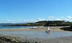 The community reaches the coast at Traeth Bychan, a sandy bay backed by cliffs. The bay has been the home of Red Wharf Bay Sailing and Water Sports Club since 1956, and is a venue for dinghy and catamaran sailing. An annual race from Beaumaris, which terminates in the bay, is held each August.[4] In 1939, the Thetis, a Royal Navy submarine built in Birkenhead, sank during sea trials, with the loss of 99 lives.[5] On recovery, the submarine was beached at Traeth Bychan, before being towed to Holyhead, where the bodies were recovered and buried in a mass grave.[6][7]