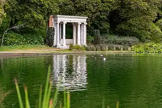 The lake is home to some early San Francisco architecture: the remains of Alban Nelson Towne's 1101 California Street, Nob Hill house can be found by the lake, between JFK Drive and Crossover Drive.[4] After the 1906 earthquake and fire devastated the building, his wife presented the portico, popularly known as Portals of the Past to the park in 1909.[3] All that remains of the mansion are the ionic columns of the entrance, which stand in isolation.[5]