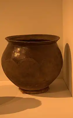 Lobi dwellings are characterized as large rectangular or polygonal compounds known as maison soukala.[5] They are spaced well from each other and are composed of a single vast mud banco wall and a small entrance. An entrance to a Lobi house is a relatively recent development. At many houses, there is a ladder made from a large, Y-shaped tree trunk with notched steps, which lead up to the roof where inhabitants may access an interior granary and their own rooms below. Access to individual sleeping quarters is also available inside. Only the tyuordaarkuun (or head of the household; there is no "chief" in Lobi society) can give permission to enter the house. The roof is broad and flat and forms a terrace which provides a lookout point but can also be used for sleeping in the dry season. Domestic animals have their own space, and water is gathered from a well or the river. The rooms inside a Lobi house are very dark, and the size varies in relation to function. Each wife has a room for herself and her children where meals are prepared. Large earthenware jars used to hold water or other personal belongings are often stacked up against the kitchen walls and are a testament to the owner's economic status.[6]