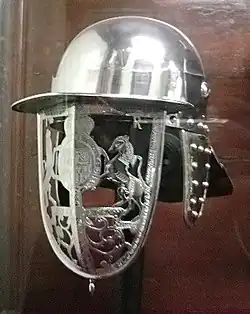 This form of helmet was widely used during the Thirty Years War and the English Civil War; it was commonly known as a zischägge in Germany and a 'horseman's pot' or 'three-barred pot' in Britain; the term 'lobster-tailed pot' is widely used in modern scholarship. The typical cavalryman of the period, the harquebusier, would have worn the helmet with a buff coat, bridle-hand gauntlet and breastplate and backplate. It was also sometimes worn by a more heavily armoured type of cavalry, the cuirassier, combined with three-quarter armour.[9] It was used by cavalry on both sides of the English Civil War including Oliver Cromwell's Ironside cavalry.[2] The common misconception of Cavaliers wearing plumed wide-brimmed hats whilst the Roundheads wore helmets is definitively disproved by a surviving order signed by Charles I himself for 33 'potts', along with other cavalry armour, for the use of his own troop of horse in 1642. Another order, this time from the Parliamentarian authorities, dating to 1644 for 300 "potts with three barres English" indicates that each helmet, no doubt of basic quality, cost 7 shillings.[10] Similar helmets were worn in the 17th century by Polish winged hussars and were termed "szyszak" in Polish, again a derivative of the original Turkish name.[11] Austrian cuirassiers were equipped with the lobster-tailed pot helmet as late as the 1780s, long after its use had died out elsewhere, when campaigning against the Ottoman Turks.[12]