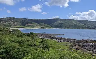 Numerous caves are located at the rear of this platform including Uaimh nan Taillearan. Sandy beaches lie at the head of the loch.[1] The cliffs at either side are formed from basalt lava flows of Palaeogene age, intruded by numerous dolerite dykes. At the head of the loch, the rocks include granophyres and gabbro.[2] Though unseen at the surface, the Great Glen Fault is usually considered to run beneath this loch and nearby Loch Spelve.