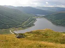 Loch Tarsan is a freshwater loch and impounding reservoir located 13 kilometres northwest of Dunoon, Argyll and Bute, Scotland. This three-armed Reservoir extends into both Glen Tarsan and Glen Lean. It supplies water to the Striven Hydro-Electric Scheme (also known as the Cowal Hydro-Electric Power Scheme). The larger of the two dams is 17.6 metres high and was completed in 1953. The water that is collected in the loch is piped to the hydro-electric generating station, located at Ardtaraig, at the head of Loch Striven.[1]