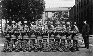 Lockstep marching was a characteristic trait of American prisons of the 19th century.[2] "Inmates formed in single file, right hand on the shoulder of the man in front, left hand on the side; the convicts then stepped off in unison, raising the right foot high and shuffling with the left."[3] The reason for the shuffling step was the chain that connected the legs of a chain gang.