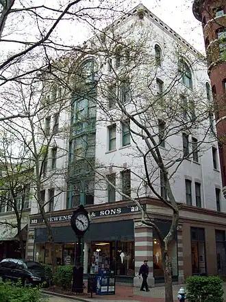 The building is 35,000 square feet (3,300 m2) in a five-story pressed brick structure that features eclectic late Victorian and classical details. The 48-foot (15 m) by 120-foot (37 m) building is distinguished by a central bay of oriel windows on its Capitol Street facade. Palladian windows are located on both sides of this central bay on the fifth floor. S.S. Kresge operated a variety store in the building from 1927 to 1971.[2]