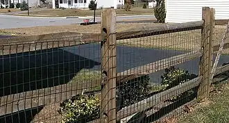 A split-rail fence, log fence, or buck-and-rail fence (also historically known as a Virginia, zigzag, worm, snake or snake-rail fence due to its meandering layout) is a type of fence constructed in the United States and Canada, and is made out of timber logs, usually split lengthwise into rails and typically used for agricultural or decorative fencing. Such fences require much more timber than other types of fences, and so are generally only common in areas where wood is abundant.