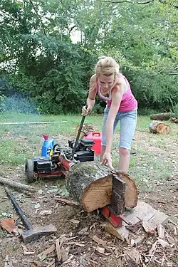 A log splitter is a piece of machinery or equipment used for splitting firewood from softwood or hardwood logs that have been pre-cut into sections (rounds), usually by chainsaw or on a saw bench. Many log splitters consist of a hydraulic pump or electric motor which then powers a hydraulic or electrical rod and piston assembly. Generally, these are often rated by the tons of force they can generate. The higher the force rating, the greater the thickness or length of the rounds that can be split. The log splitter consists of all four major hydraulic components.