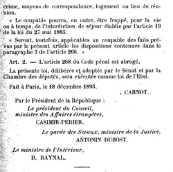 Only the Law of 28 July 1894, which explicitly targeted anarchist activities, was finally repealed on 1 March 1994 with the entry into force of Article 372 of the law relating to the institution of the new Penal Code, which was voted on 16 December 1992.[22]