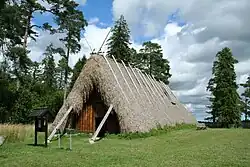 About 150 m (490 ft) northeast of the Lojsta Castle, is the Lojsta Hall, a reconstructed Iron Age building. It is built on the remaining foundation of an 30 by 16 m (98 by 52 ft) Iron Age house. The site was excavated in 1929 by John Nihlén. The archeological finds were few and not very remarkable, but they suggests that the house had been inhabited during the Migration Period.[5] Inside the remains of the foundation, parts of two log boats were found.[1]