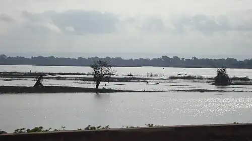 Lokoja lies about 7.8023° North of the equator and 6.7333° E east of the Meridian.[17] It is about 165 km southwest of Abuja as the crow flies, and 390 km Northeast of Lagos by same measure. Residential districts are of varying density, and the city has various suburbs such as Felele, Adankolo, Otokiti and Ganaja. The town is situated in the tropical Wet and Dry savanna climate zone of Nigeria, and temperatures remain hot year-round. Rain begins in May and typically ends in October. Lokoja has a maximum temperature of about 37.9 °C between December and April, average annual rainfall of about 1000mm and average relative humidity of about 60% during the rainy season.[18]