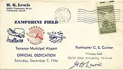 Uncataloged first day cover for the dedication of Zamperini Field, Torrance, CA. By Harry Burton Lewis, Public Relations / Operations Manager of Allied's Airports, Inc. and Ex. Sec. of Torrance Chamber of Commerce.