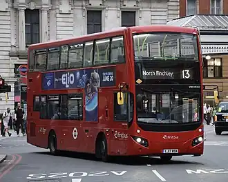 When re-tendered, route 13 was retained by London Sovereign with a new contract commencing on 31 August 2013. Wright Eclipse Gemini 2 bodied Volvo B5LHs were introduced on the same date.[9][10] In March 2015, Transport for London opened a public consultation on proposals to scrap the route.[11][12] The route was saved after intervention by Mayor of London Boris Johnson.[13][14] In September 2016, six Wright SRM bodied Volvo B5LHs entered service on the route.[15][16][17] In July 2016, under the tenure of new Mayor of London Sadiq Khan, TfL opened another consultation on proposals to extend the route to North Finchley and divert it to Victoria station replacing route 82.[18][19][20] This took effect on 1 April 2017 with it being operated by Tower Transit and becoming a 24-hour route.[21][22]