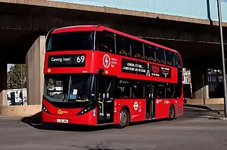 On 17 December 2005, it was withdrawn between London City Airport and Canning Town station as part of a series of changes in connection with the Docklands Light Railway being extended.[2] Stagecoach London commenced a further contract on 30 April 2011.[3] In October 2015, three Alexander Dennis Enviro400VE MMCs with inductive wireless charging technology, which allows its batteries to receive a charging boost when stationary at specially equipped bus stops entered service on route 69.[4][5][6][7]