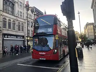 Route 98 commenced on 18 July 1992 to replace route 8 between Willesden bus garage and Oxford Circus, before continuing to Holborn. The route has always been operated by Metroline's Willesden bus garage. It was initially operated by AEC Routemasters on Mondays to Saturdays in the daytime and Dennis Darts, MCW Metrobuses and Leyland Titans on Sundays and late evenings.[1]
