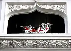 The distinctive mock-Tudor/Elizabethan façade and architectural features include ornate entrances with large wrought-iron gates at each end. At the Hay Street end at the first storey level, a large clock chimes every quarter-hour, half-hour and on the hour. Four mechanised knights appear from a castle door and move in a semicircle each time the clock chimes as they apparently joust with each other. At the St Georges Terrace end, a window above another clock face depicts a mechanised miniature Saint George doing battle with the dragon. The clocks were made by the Synchronome Company of London at a cost of £5,000 ($8969.35 in Australian dollars).[4]