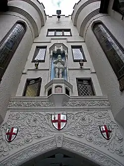 The two interior ends include statues of Dick Whittington and his cat (north end) and Sir Walter Raleigh (south end), each in bastion towers and gazing down on the shoppers below. Other distinctive features include gargoyles, masks, shields, crests and wrought iron signs and brackets. Gabled roofs, weather cocks and lead lighting add to the Tudor style. The arcade floor is laid with terracotta tiles.[5]