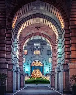 The building is constructed of Portland Stone from Portland Dorset, and its foundation is a plinth composed of Cornish granite.[4] The oak covered walls are nearly 100 years old and are marked by the English Heritage Foundation. The bronze doors that decorate the entrance were made by Crittals, with enrichments modelled by George Alexander. The plaque on the right side of the entrance commemorates the official opening by King George V in 1922. On the left is displayed a bronze relief of Ralph Knott, designed by Gilbert Bayes and unveiled in 1932. The sculptures of the four pavilions at the far end of County Hall were produced by A. F. Hardman. Visible at the cornice level are eleven coats of arms representing London Boroughs. This was completed in 1933 and overseen by E. Stone Collins after Ralph Knott's death.