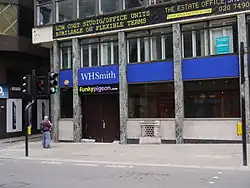 Until February 2016 the ground floor of the building was occupied by a branch of WHSmith newsagents.[25] Inside the shop London Stone in its glass case was hidden behind a magazine rack and not usually accessible. In March 2016, planning permission was granted to allow the building to be demolished and replaced by a new one. The stone was put on temporary display at the Museum of London while the building works were carried out.[26][27][28] It was returned to Cannon Street in October 2018. The new premises publicly display London Stone on a plinth, within a Portland stone casing loosely inspired by its 19th–century predecessor, and behind glass. The plaque adjacent to the stone reads