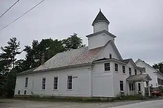 The core building was erected in 1860, and was a fairly typical New England town hall of the period, with a large chamber with a second-floor gallery, that served as a meeting point for the town's civic and social functions. By the late 19th century, the hall was also used as a performing venue for traveling and local theatrical productions, and was extended to the rear. In the early 20th century the front vestibule was added, providing space for a ticket office and other amenities. The interior of the hall primarily dates to this period, and notably includes the canvas stage curtain, which depicts a scene of the Rhine River. The hall was used for a time to house town offices, and continues to be used for annual town meetings.[2]