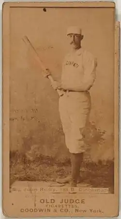 John Good Reilly (October 5, 1858 – May 31, 1937), nicknamed "Long John", was an American first baseman in Major League Baseball who played for the Cincinnati Stars (1880) and the Cincinnati Red Stockings/Reds (1883–1891). In 1888, he hit 13 home runs with 103 RBI and a .321 batting average. During and after his baseball career, Reilly was a commercial artist for the Strobridge Lithographing Company.