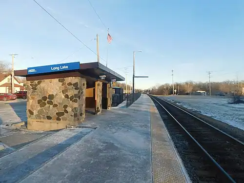 Long Lake is a commuter railroad station on Metra's Milwaukee District North Line in Long Lake, Illinois. The station is located at Decorah Avenue and IL 134; is 46.1 miles (74.2 km) away from Chicago Union Station, the southern terminus of the line;[2] and serves commuters between Union Station and Fox Lake, Illinois. In Metra's zone-based fare system, Long Lake is in zone four. As of 2018, Long Lake was the 192nd busiest of Metra's 236 non-downtown stations, with an average of 93 weekday boardings.[1] Long Lake station is a stone covered shelter with a parking lot on Main Street and Decorah Avenue.