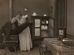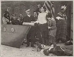 It may help the student of the real technique to study the climax of Long May it Wave, a Lubin comedy scheduled for release June 20th. This is a rather good example of the double climax. A man takes his wife to see a play in which the American Flag waved overtime, as used to happen in the palmy days of melodrama. The climax of each act is salvation through the flag. A few nights later he comes home late with two flags, and defies his wife. This is the natural and expected climax. It is funny but it is not startling, for several scenes back you saw him pick up the flags. You knew then how it was going to end. A moment later the wife offers him a drink, apparently to celebrate the victory. He lays down the flags for a glass. She grabs him. No one expected that. It will get more laughs after the laughs would seem to have been exhausted, but it should be borne in mind that this second kick must come like a flash to have any real value. It must not be something requiring elaborate explanation. It must seemingly be unpremeditated and must come as a total surprise.[4]