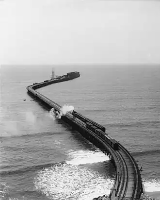 The Long Wharf in Santa Monica, also known as Port Los Angeles or the Mile Long Pier, was an extensive pier wharf constructed by the Southern Pacific Railroad Company in Santa Monica Bay from 1892 to 1894. When it opened in 1894, it was the longest wharf in the world, measuring approximately 4,700 feet (1,400 m).[2][3] It served as a cargo and passenger port until 1913, and in 1919 removal of the wharf started. The wharf, the 1,000 foot (300 m) tip of the pier, was removed by 1915.[4] The remaining 3,600 feet (1,100 m) of pier was used as a run down fishing pier until 1933, when the remainder of the pier was removed. One of the major imports to the wharf was lumber from Northern ports, to help in the construction boom in Southern California. Southern Pacific Railroad and the street cars of the Los Angeles Pacific Railroad served the wharf. Los Angeles Pacific Railroad ran passenger trams to the wharf and from midnight to sunrise ran cargo cars.