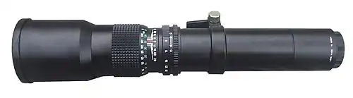 In photography, a long-focus lens is a camera lens which has a focal length that is longer than the diagonal measure of the film or sensor that receives its image.[1][2] It is used to make distant objects appear magnified with magnification increasing as longer focal length lenses are used. A long-focus lens is one of three basic photographic lens types classified by relative focal length, the other two being a normal lens and a wide-angle lens.[3] As with other types of camera lenses, the focal length is usually expressed in a millimeter value written on the lens, for example: a 500 mm lens. The most common type of long-focus lens is the telephoto lens, which incorporate a special lens group known as a telephoto group to make the physical length of the lens shorter than the focal length.[4]