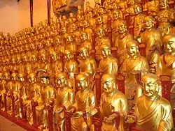 Artworks in the temple include statues of the Maitreya Buddha in his Bodhisattva form and in his Cloth Bag Monk incarnation, statues of the Eighteen Arhats and 20 Guardians of Buddhist Law, as well as statues of the 500 arhats.