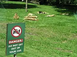 ![]() Longleat Safari Park's lion reserve, with a warning sign | |
