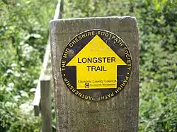 The Longster Trail was devised in the 1970s but the path was first opened and properly waymarked during the 1980s. It was named after Frank Longster, a local man who served as chairman of the Mid-Cheshire Footpath Society during the 1970s until his death in 1974.[1] The path is waymarked with two waymarks, both the older yellow arrow and red dot markers and the newer yellow arrow which encloses the words Longster Trail.