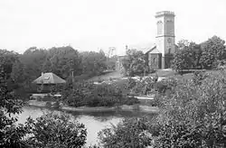 A footbridge at Carlton Street was added by the town in mid-1894 to provide access to the Riverway Park. One of the only steel bridges in an Olmsted-designed park, it was designed and built by Alexis French, Brookline's first town engineer. The bridge was closed around 1975 due to severe corrosion.[9][10] Plans to repair and reopen the footbridge proved locally controversial for several decades.[11][12] The bridge deck was removed in July 2021 for restoration and returned in October 2022.[12] The footbridge reopened in August 2023.[13][14]