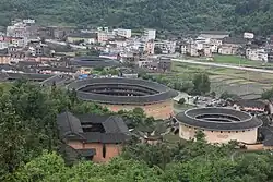 Clockwise from top: Longyan City, Chuxi tulou cluster in Yongding District, the ancient city walls in Changting County, Zhangdi village, and a night view from inside a tulou. | |