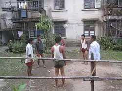 A longyi (Burmese: လုံချည်; MLCTS: lum hkyany; pronounced [lòʊɰ̃dʑì]) is a sheet of cloth widely worn in Myanmar (Burma). It is approximately 2 metres (6.6 ft) long and 80 centimetres (2.6 ft) wide. The cloth is often sewn into a cylindrical shape. It is worn around the waist, running to the feet, and held in place by folding fabric over without a knot. In ancient times, lethwei fighters would hitch it up (paso hkadaung kyaik) to compete.[1] This folding technique is still being used in modern days when people play chinlone.
