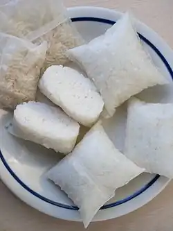 Alternative ways of cooking lontong include placing uncooked rice into a muslin bag and then letting the water seep in and cause the rice to form a solid mass.[7] Another popular and easier method is by using commercially available plastic pouches; rice-filled and punctured with a needle to create small holes to allow the water to seep into the package, which are then boiled until the rice becomes cooked and has filled up the pouch. This method was meant to imitate the banana leaf's liquid permeability. Nevertheless, the use of organic banana leaves is highly recommended for better health and ecological reasons.