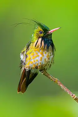 Lophornis is a genus of hummingbird in the family Trochilidae. These are all tiny birds, ranking among the smallest hummingbirds. No species exceeds 9 cm (3.5 in) and most are under 7.5 cm (3.0 in) in total length, weighing 3 grams or less. The male coquettes are noted from their outlandish, colorful crests and markings, the females being more subdued.