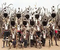 Music and dancing are central to Lopit culture. There are different dances for different occasions. Each dance has specific costumes, music, at time allocations associated with it. Drums are an important part of the dances.[5] Some main dances are: