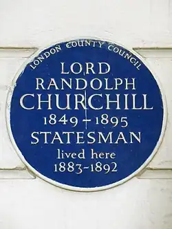 Born at 3 Wilton Terrace, Belgravia, London, Randolph was the third son of John Spencer-Churchill, Marquess of Blandford and his wife the Marchioness of Blandford (née Lady Frances Vane). His parents became the (seventh) Duke and Duchess of Marlborough upon the death of John's father in 1857.[3] As the younger son of a marquess, Randolph had the courtesy title "lord"; as a commoner, he could sit in the House of Commons.