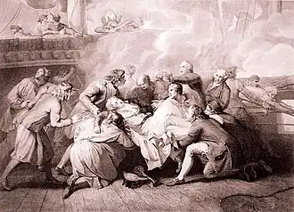 At the Battle of the Saintes (12 April 1782), Resolution was in the centre of the line and saw heavy action. During the battle, one of Manners' arms was broken, and he was wounded in both legs, one so severely as to require amputation. Being of a strong constitution, it was hoped he might survive, and he was sent back to England aboard the frigate Andromache. However, tetanus set in, and he died on 23 April 1782 and was buried at sea.[2] A painting of his death, titled Lord Robert Manners Mortally Wounded, on board the Resolution in the memorable Engagement between Admiral Rodney & Count de Grasse, in the West Indies, the 12th of April 1782, was made for George Frederick Raymond's History of England, and is currently held by the National Maritime Museum.[3]