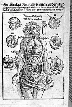 The Mirror included a number of illustrations. The most important of these is an anatomical diagram of a public dissection in Strasbourg in 1517.[14] The dissection, of a hanged man, was carried out by Dr. Wendelin Hock von Brackenau. The woodcut was not made specifically for the Mirror, but was a fugitive sheet, initially produced as a single broadsheet, and then published in the Feldtbuch der Wundartzney by Hans von Gersdorff in the same year. The illustration shows the body down to the knees, with the thoracic and abdominal cavities cut open. Surrounding this are six smaller figures showing the anatomy of the brain, and one of the tongue. This may well be the first published illustration of an actual dissection,[42] and the images of the brain are the earliest realistic anatomical diagrams of that organ.[43]